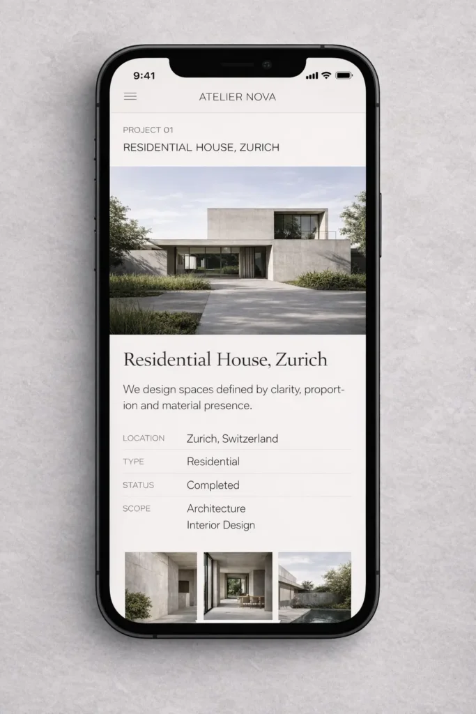Viele Architekturbüros präsentieren ihre Projekte digital ohne klare Hierarchie oder strategische Positionierung. Die Herausforderung bestand darin, eine digitale Sprache zu entwickeln, die: – räumliche Qualität transportiert – Struktur sichtbar macht – Zurückhaltung als Stärke nutzt – und dennoch eine klare Differenzierung schafft.
